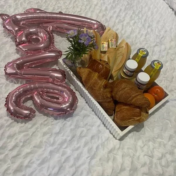 Nous proposons un petit déjeuner copieux pour deux personnes avec viennoiseries, pain, confiture, nutella, miel, jus d'orange... Le petit déjeuner est une prestation sur demande au tarif supplémentaires de 20e pour deux personnes. Il comprend pain & viennoiseries artisanales, confiture, Nutella, jus d'orange.